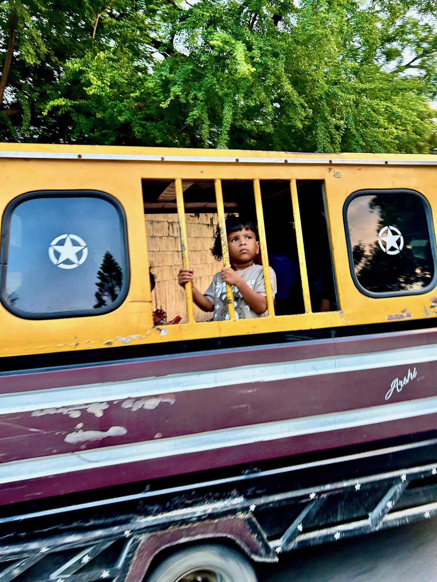 A young girl with dark hair and a light-colored shirt looking out from a yellow and red ride at an amusement park, holding onto yellow bars, with trees and a wooden structure in the background.