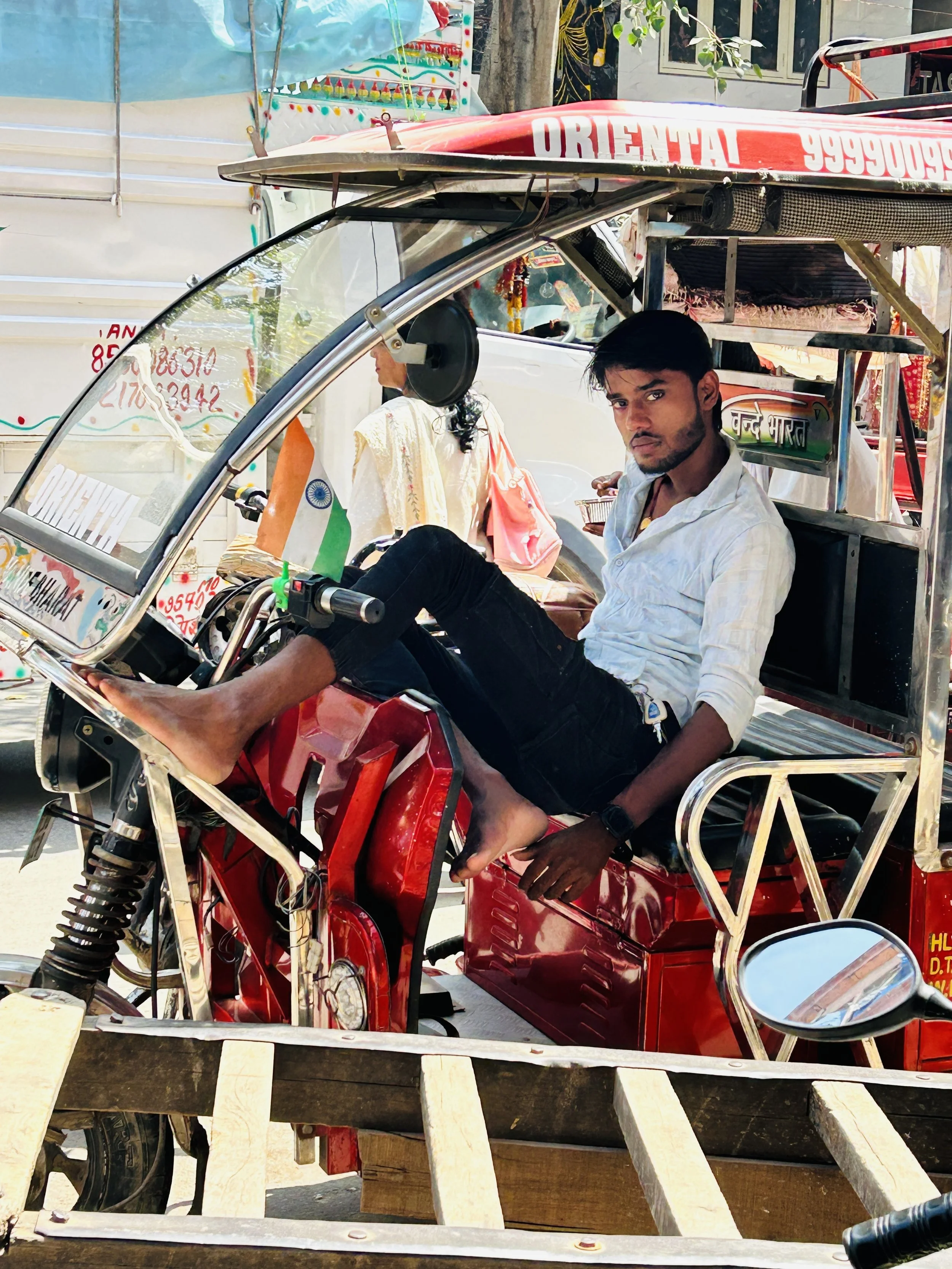 A young man sitting in a red auto rickshaw, also known as a tuk-tuk, on a busy street in India. He is dressed in a white shirt and black pants, with one foot resting on the vehicle's edge and the other foot on the footrest. The auto rickshaw has a me