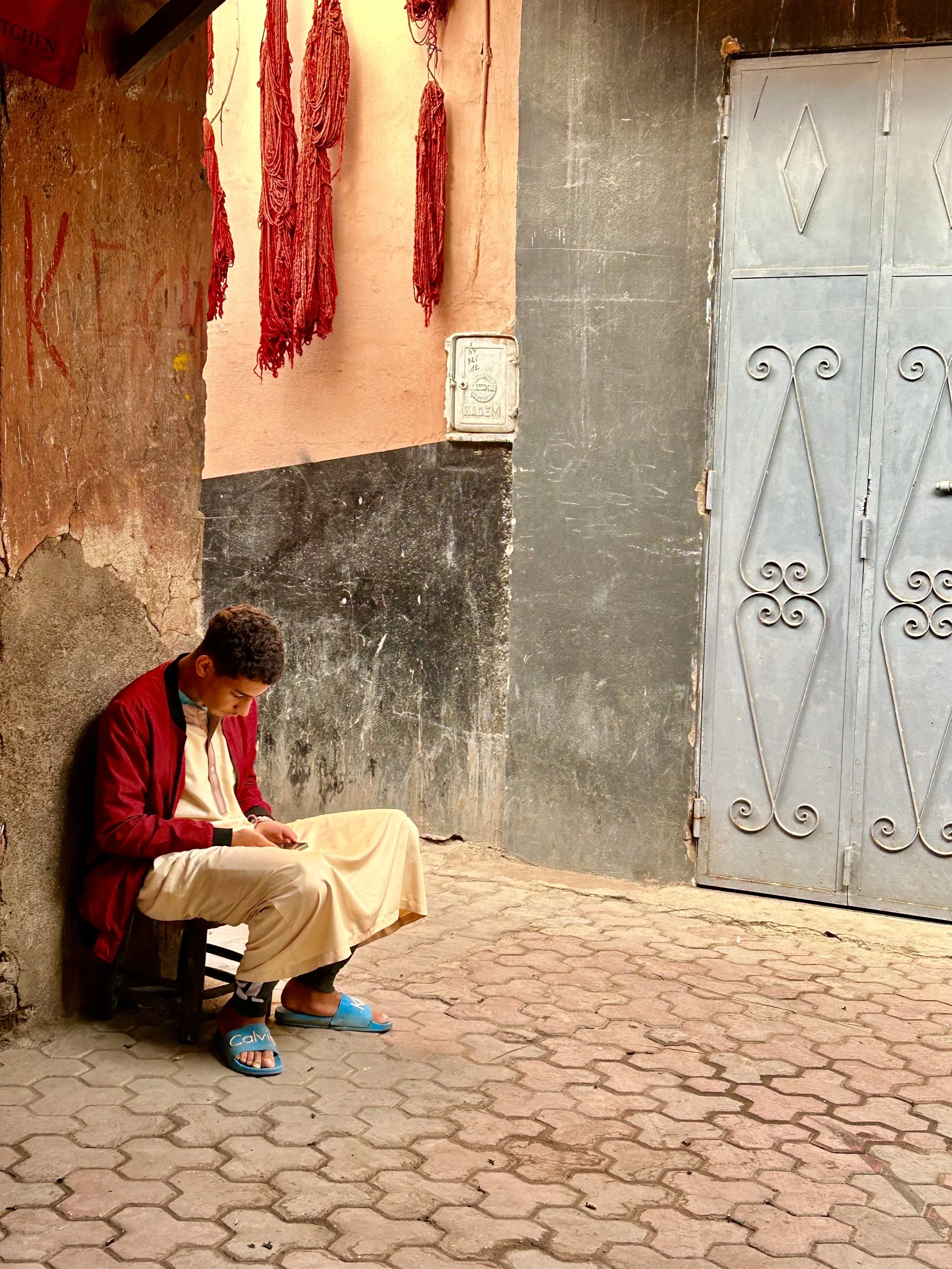 Young man sitting on a small stool on a cobblestone street, looking at his phone, with a textured wall behind him and a metal door to the right.