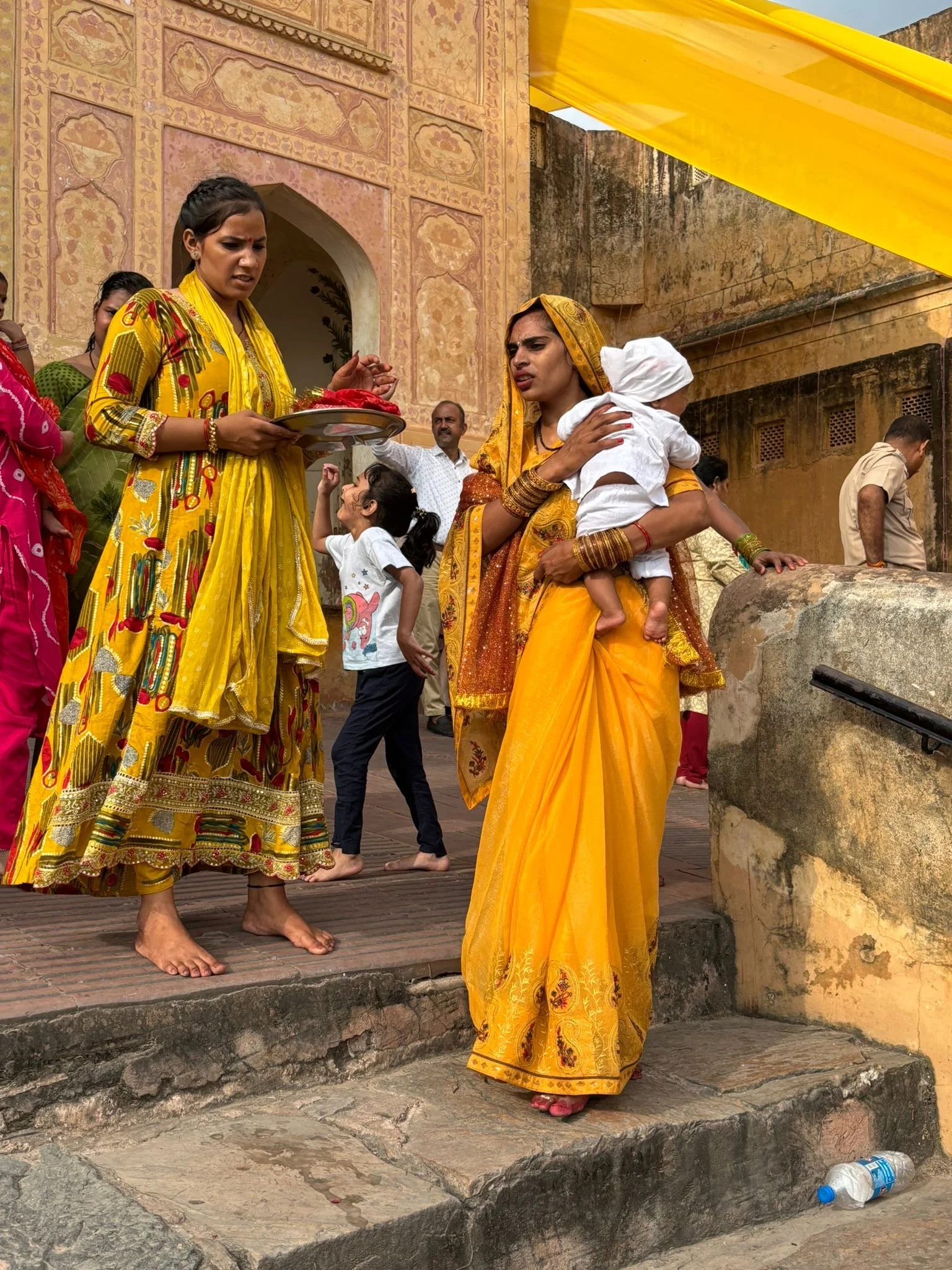 Women in traditional Indian attire participating in a religious or cultural ceremony outside a historic building, with children and other onlookers present.