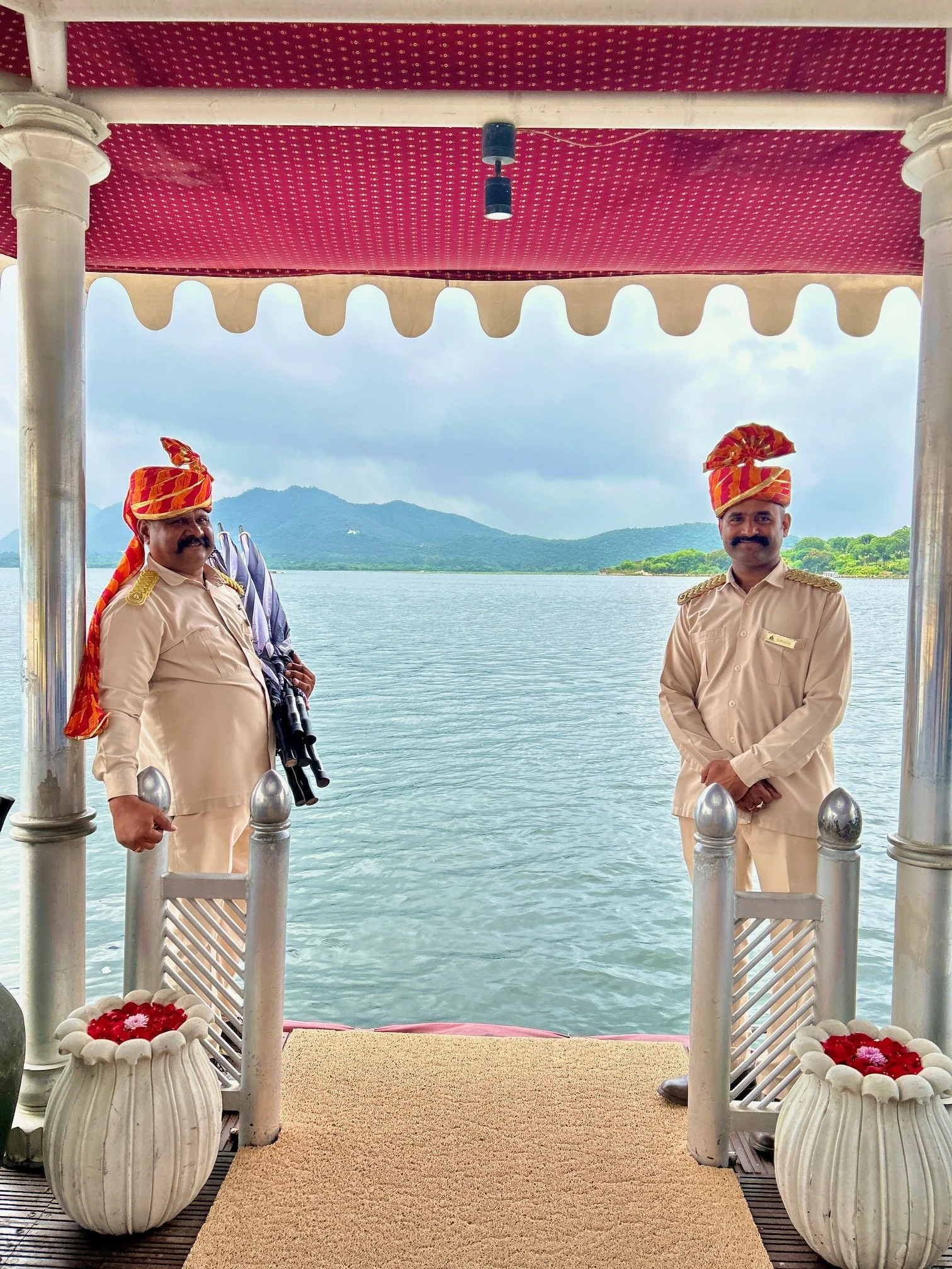 Two men in uniform with colorful turbans standing on a boat overlooking a lake, with mountains in the background.
