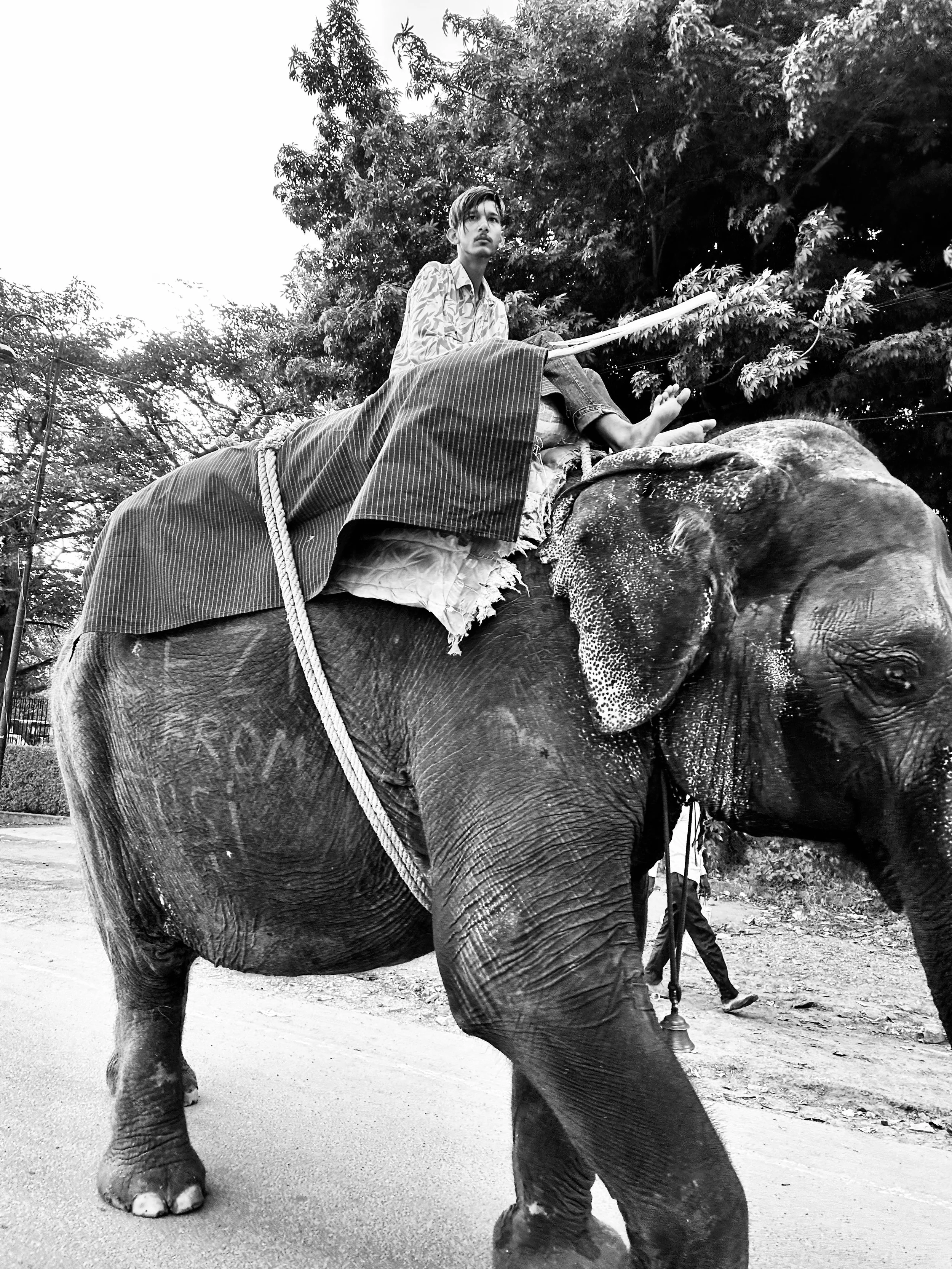 A person sitting on top of an elephant, holding a stick, with trees in the background.
